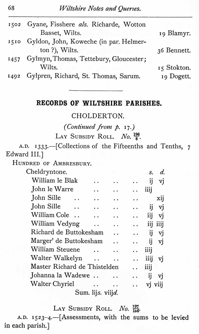 Page 21 Wiltshire Wills proved in the Perogative Court of Canterbury 1457-1502. Lay subsidy roll for Cholderton, 1333.