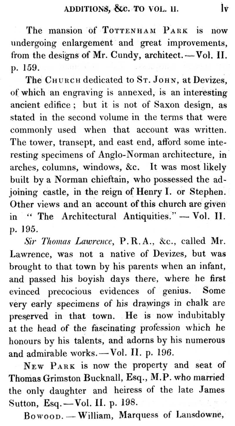 Page 56 Additions to Vols 1 and 2 ; Tottenham Park, Devizes, Bowood.