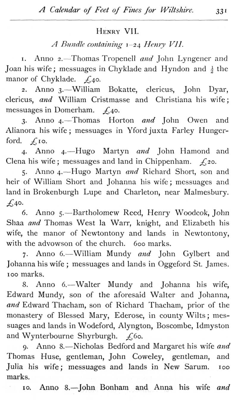 Page 30 A calendar of feet of fines for Wiltshire in the reign of Henry VII.