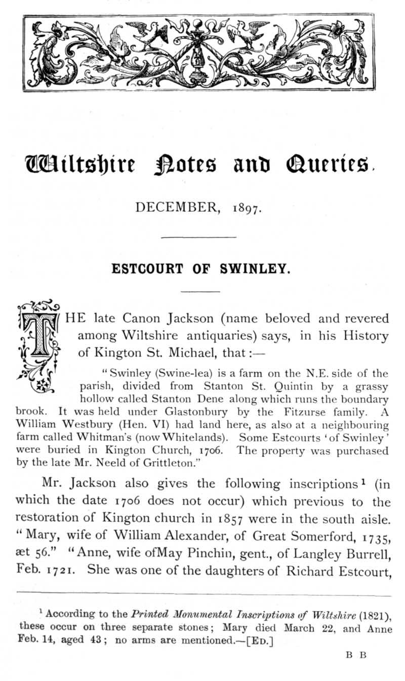 Page 2 Escourt family of Swinley, Kington St Michael.