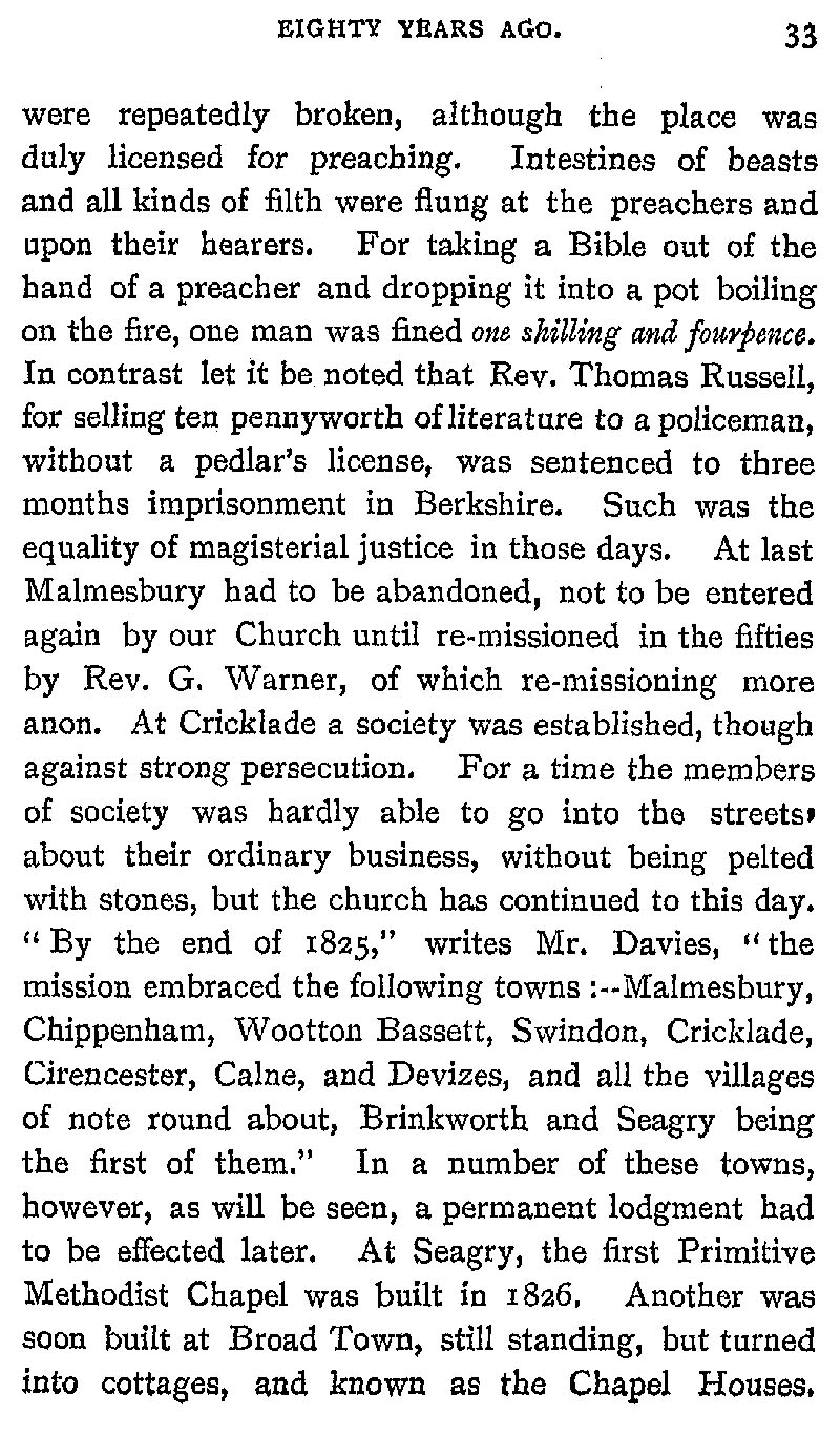 Page 7 The Brinkworth Circuit in the 1820s ; John Cennick, events at Wootton Bassett and Malmesbury.