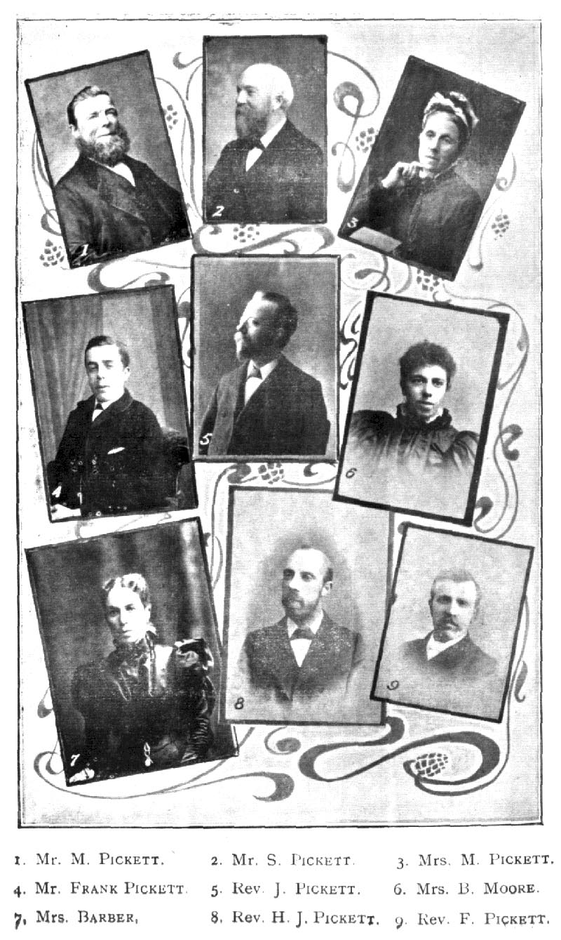 Page 17 Photographs M Pickett, S Pickett, Mrs M Pickett, Frank Pickett, Rev J Pickett, Mrs B Moore, Mrs Barber, Rev H J Pickett, Rev F Pickett.