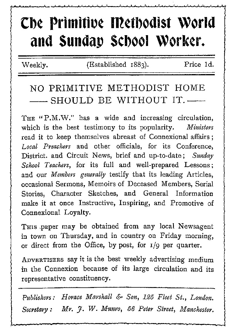 Page 65 Advertisement; The Primitive Methodist World and Sunday Worker, 1907.