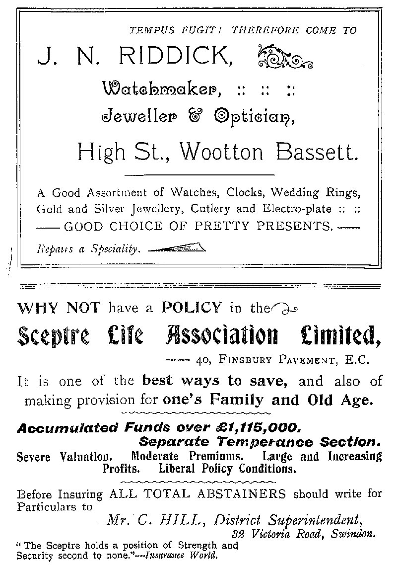 Page 68 Advertisement; J N Riddich, Wootton Bassett, 1907 ; Sceptre Life Assoication Ltd, 190700.