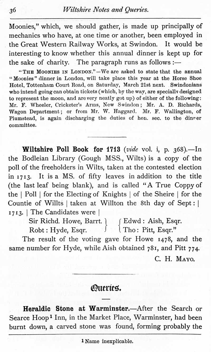 Page 37 Wiltshire Society; Wiltshire poll book for 1713; Heraldic stone at Warminster