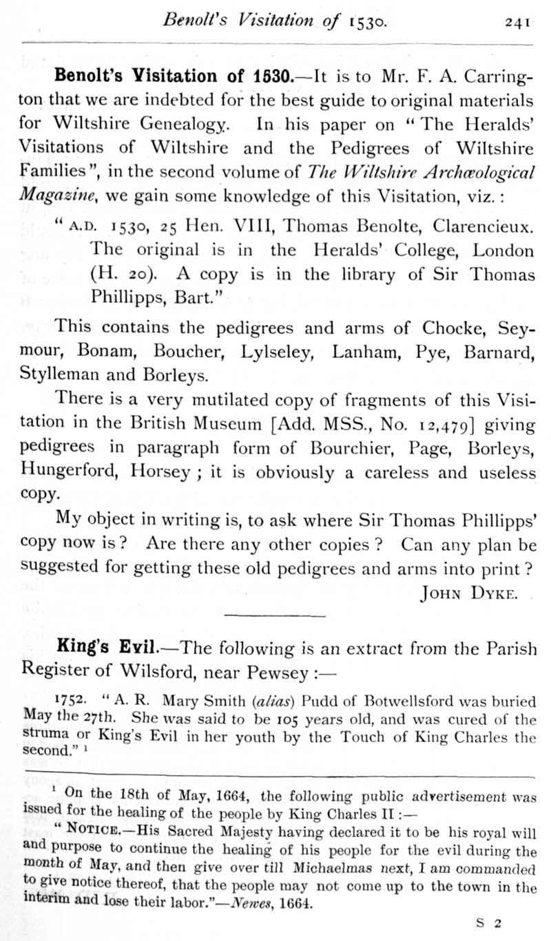 Page 36 Benolt's visitation, 1530: Cure of King's Evil at Wilsford, Pewsey