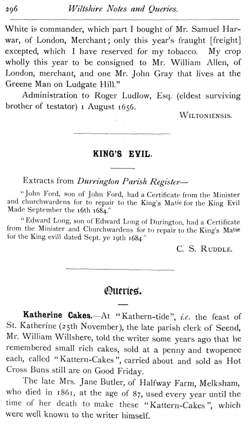 Page 44 Thomas Ludlow of Dinton, part owner of the Mayflower;King's Evil at Durrington; Katerine cakes, Seend