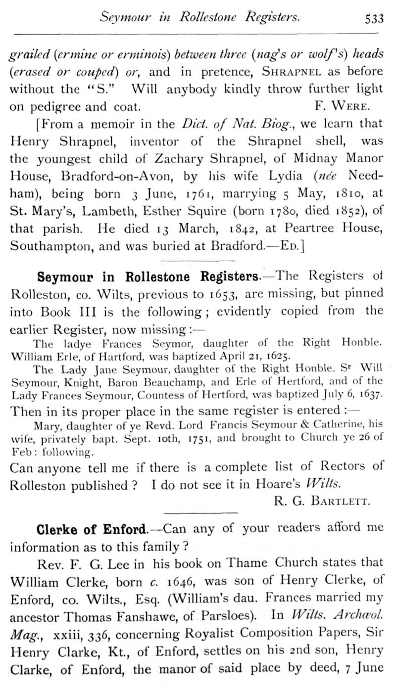 Page 40 Shrapnel family; Seymour at Rollestone, Shrewton; Clerke of Enford