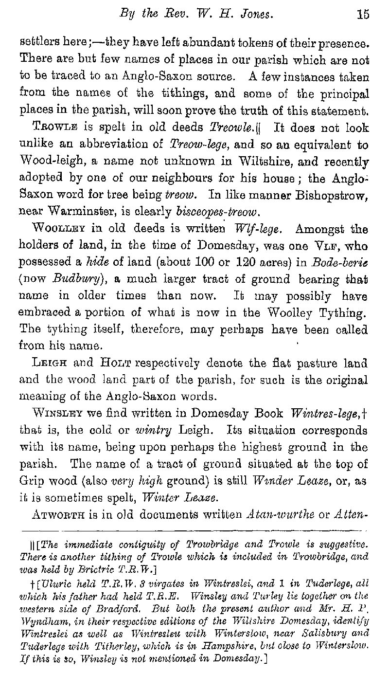 Page 15 History of Bradford on Avon from A.D. 950-1000: place-names, Trowle, Woolley, Leigh, Holt, Winsley and Atworth.