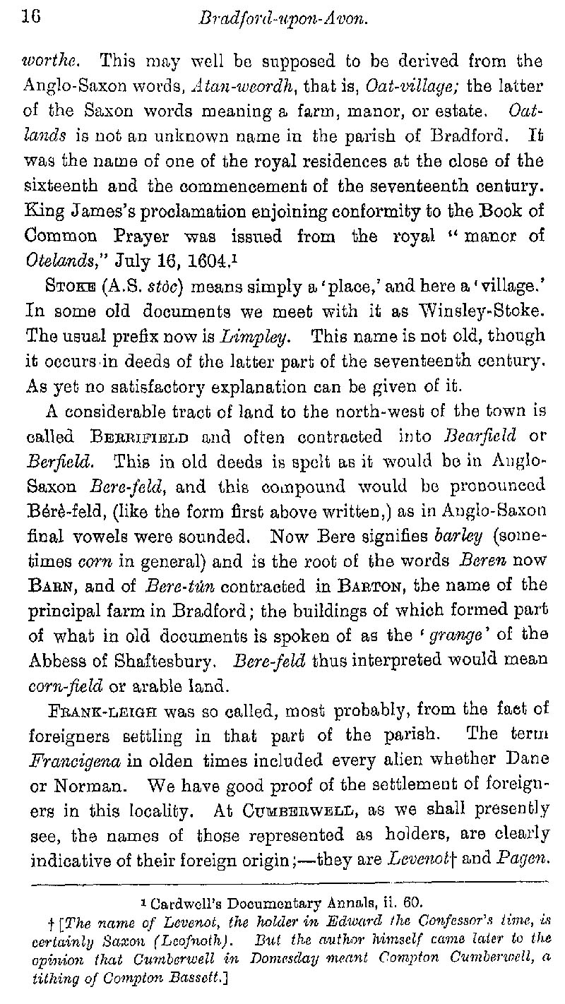 Page 16 History of Bradford on Avon from A.D. 950-1000: place-names, Atworth, Stoke, Bearfield, Frankleigh and Cumberwell.