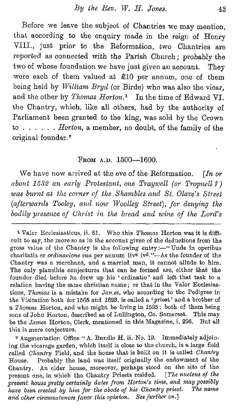 Page 46 History of Bradford on Avon from 1300-1500; chantries of William Bird and Thomas Horton. History of Bradford on Avon from 1500-1600; burning of Tropnell.