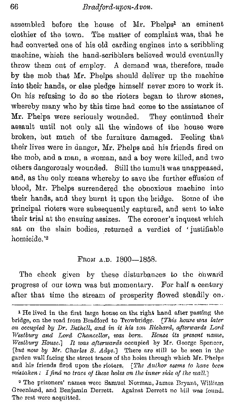 Page 69 History of Bradford on Avon from 1700-1800; expansion of the textile trade and introduction of machinery and riots. History of Bradford on Avon from 1800-1858.
