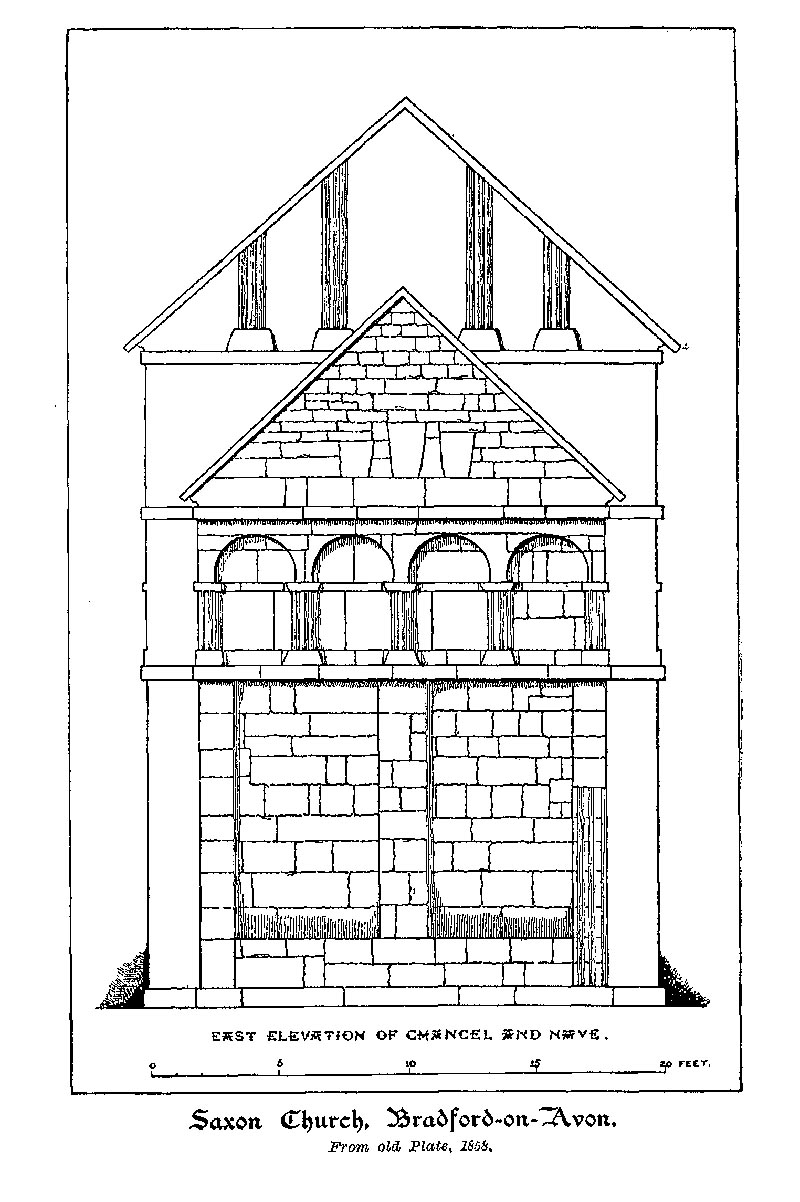 Page 49 Drawing of the Saxon Church of St. Laurence, east elevation of chancel and nave, Bradford on Avon. 1858
