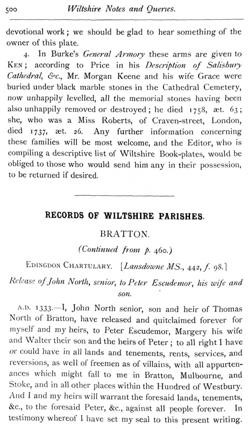 Page 7 Somer Wiltshire book plates. Bratton : transcripts of records, 1333.