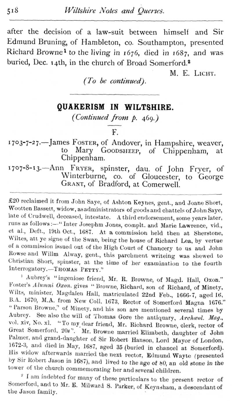 Page 25 Notes on the history of Great Somerford.Quakers in Wiltshire : marriage records.