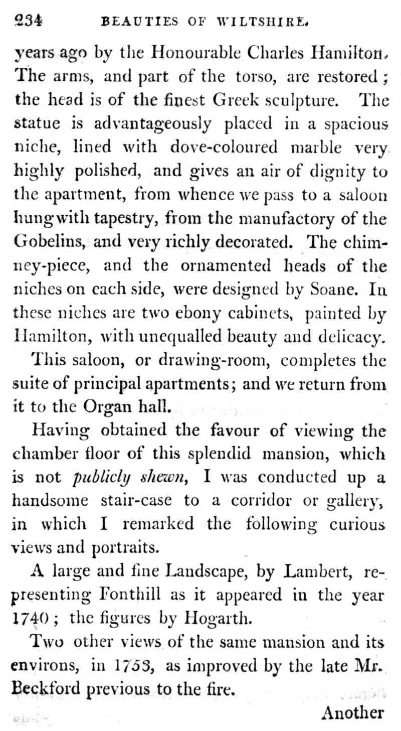 Chapter 11 Fonthill and the late 18th century mansion, with a description of the works of art it contained and an account of the grounds of the house. Notes on Hindon and Tisbury.
