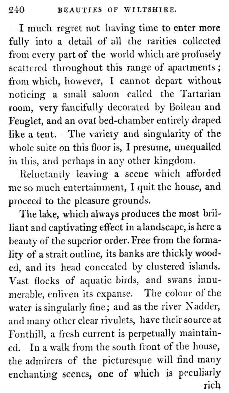 Chapter 11 Fonthill and the late 18th century mansion, with a description of the works of art it contained and an account of the grounds of the house. Notes on Hindon and Tisbury.
