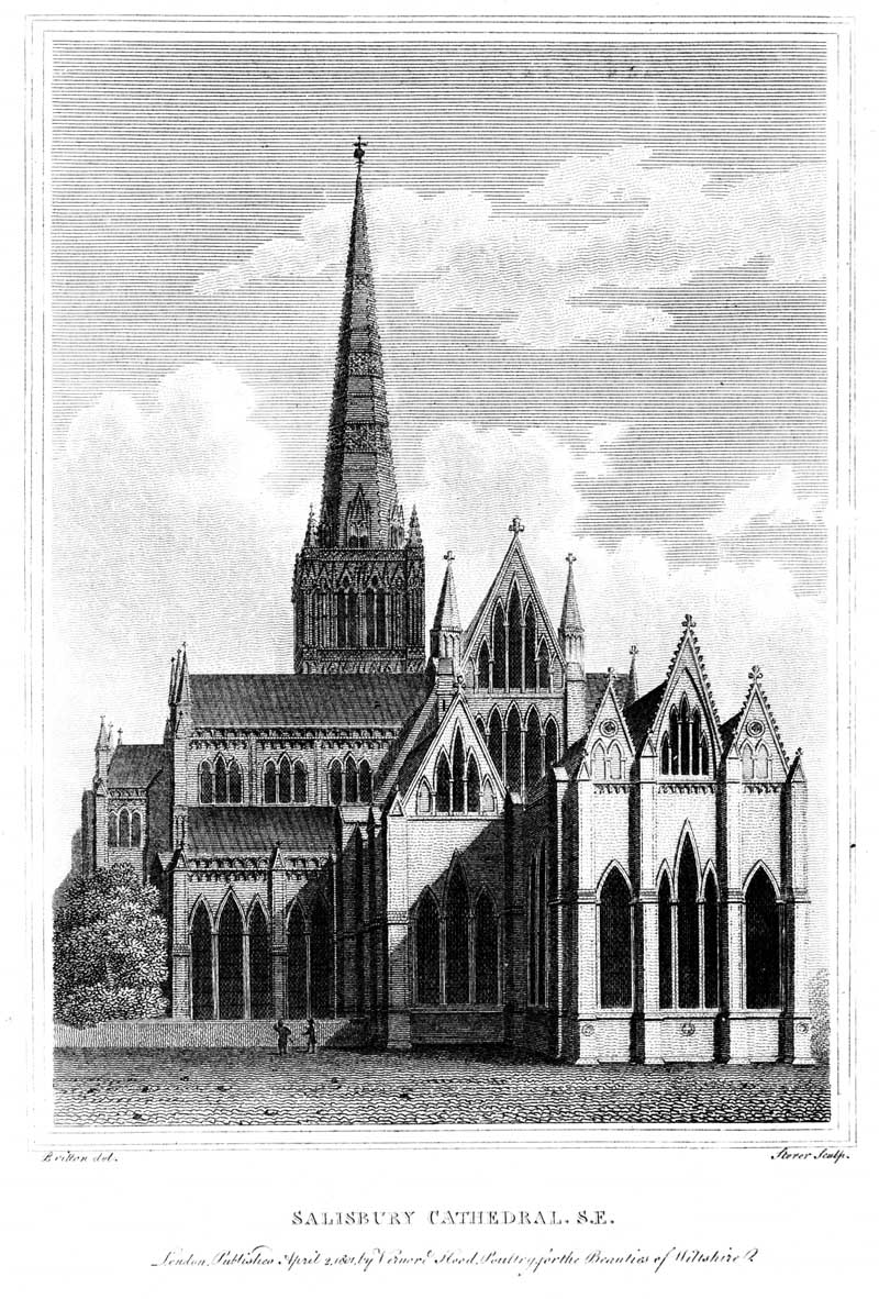 Page 1 Engraving of Salisbury Cathedral from the south-east