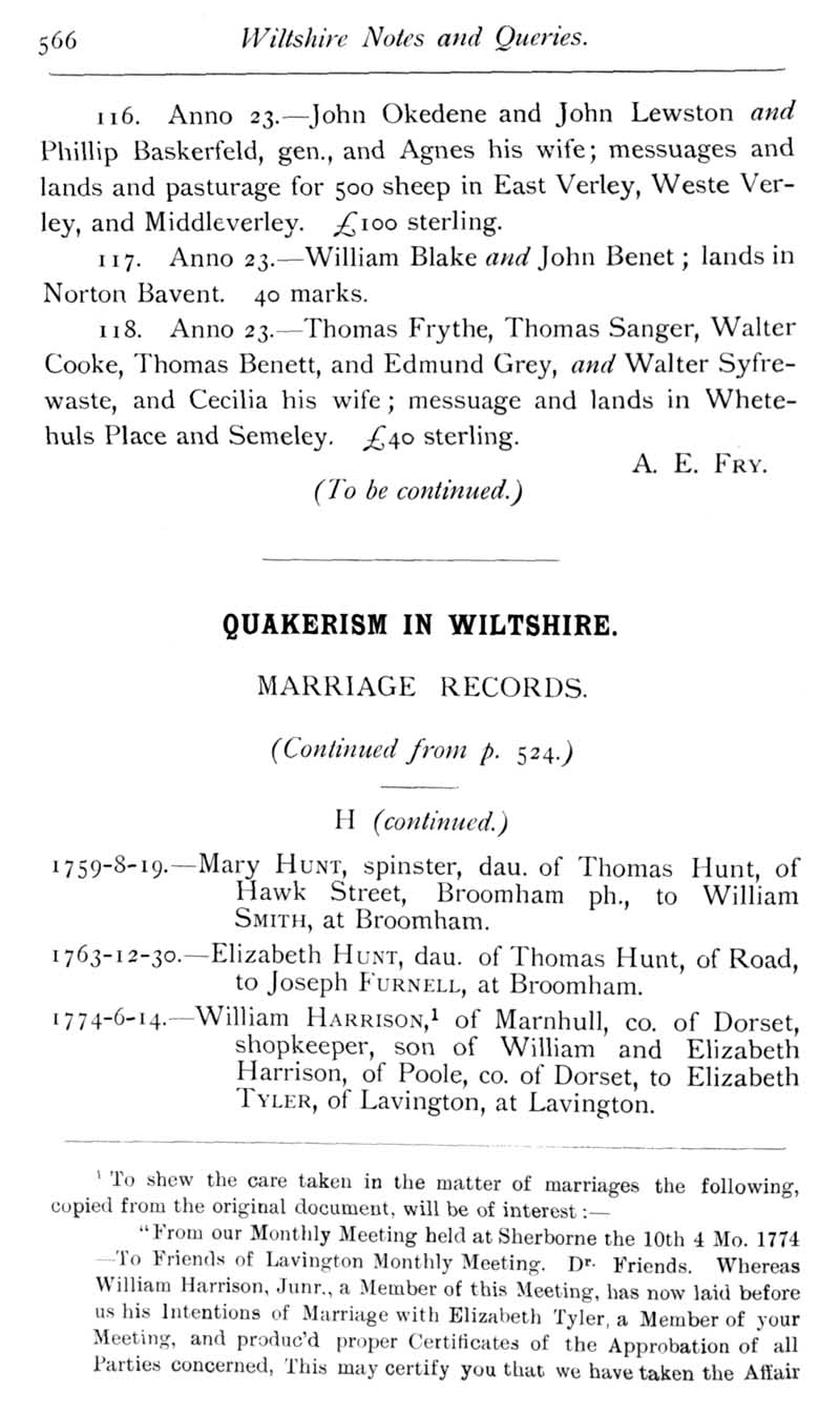 Page 25 Calendar of Feet of Fines for Wiltshire in the reigns of Henry VIII. Quakers in Wiltshire : marriage records.
