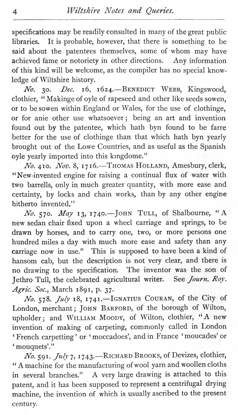 Page 4 A list of Wiltshire patentees; Benedict Webb, Kingswood, Thomas Holland, Amesbury, John Tull, Shalbourne, Ignatius Couran, London, John Barford and William Moody of Wilton, Richard Brooks, Devizes.