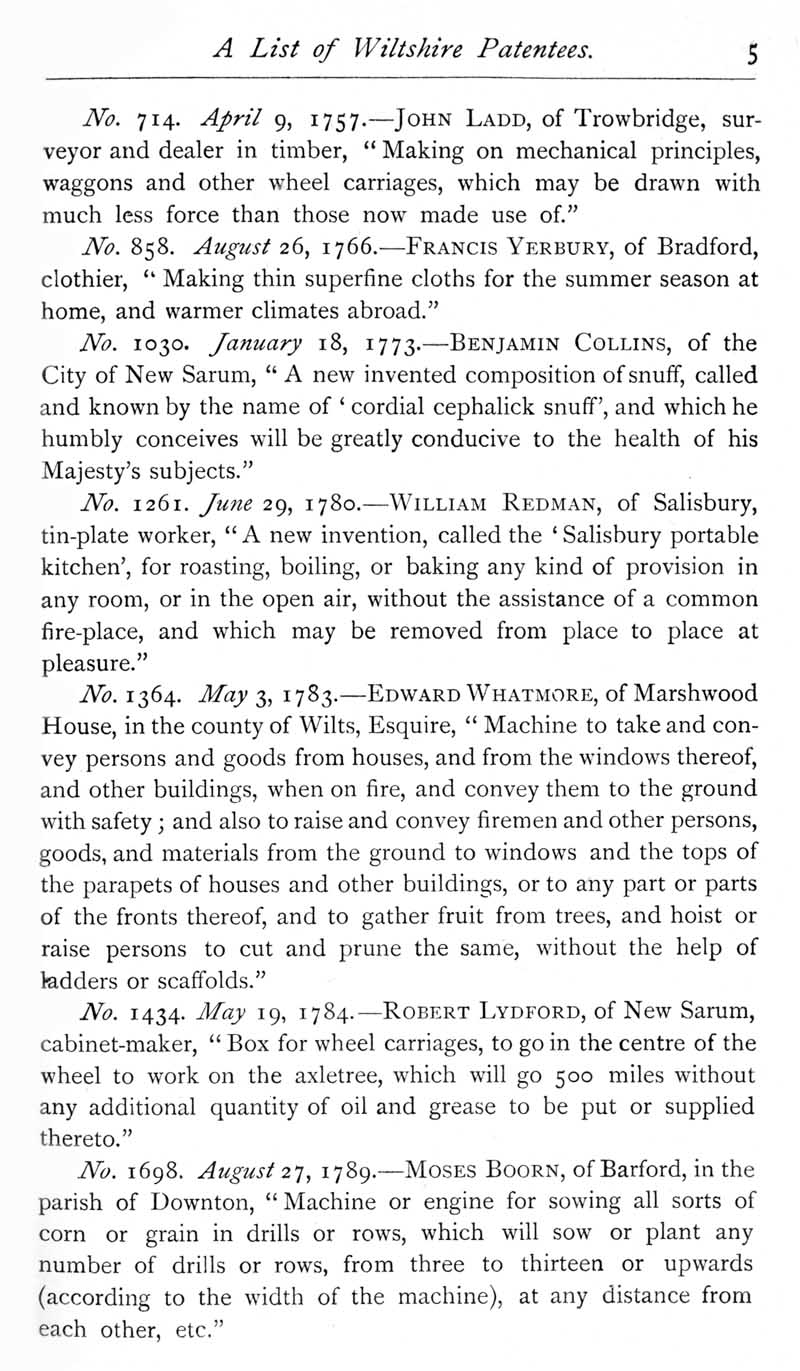 Page 5 A list of Wiltshire patentees; John Ladd, Trowbridge, Francis Yerbury, Bradford on Avon, Benjamin Collins, Salisbury, William Redman, Salisbury, Edward Whatmore of Marshwood House, Robert Lydford, Salisbury, Moses Boorn, Barford St. Martin.