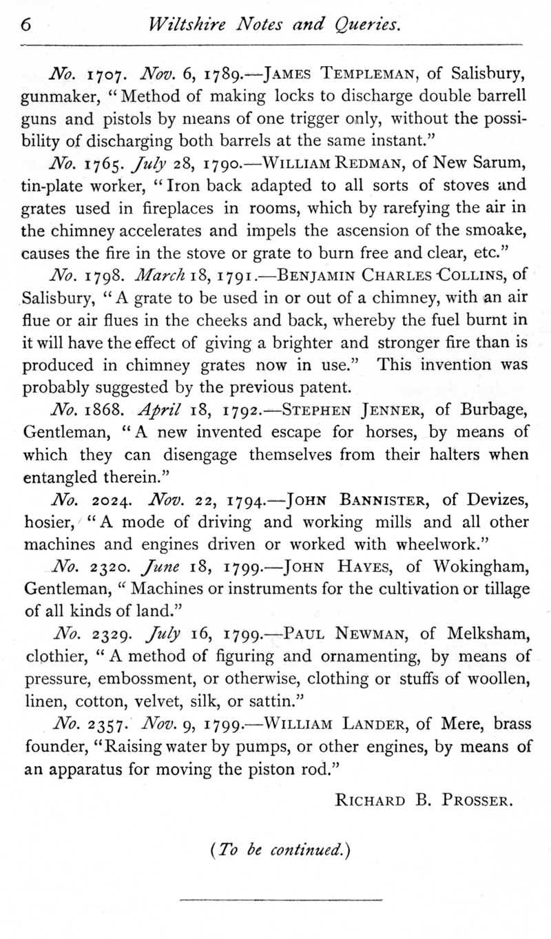 Page 6 A list of Wiltshire patentees; James Templeman, Salisbury, William Redman, Salisbury, Benjamin Charles Collins, Salisbury, Stephen Jenner, Burbage, John Bannister, Devizes, John Hayes, Wokingham, Paul Newman, Melksham, William Lander, Mere.