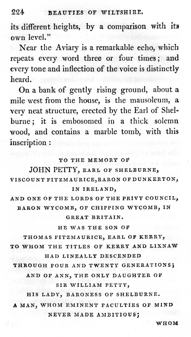 Page 13 History of Bowood; description of the grounds, the aviary and the monument to John Petty, Earl of Shelburne and Viscount Fitzmaurice.