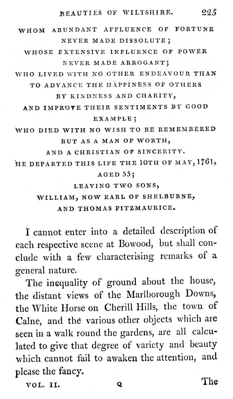 Page 14 History of Bowood; description of the grounds, the aviary and the monument to John Petty, Earl of Shelburne and Viscount Fitzmaurice.