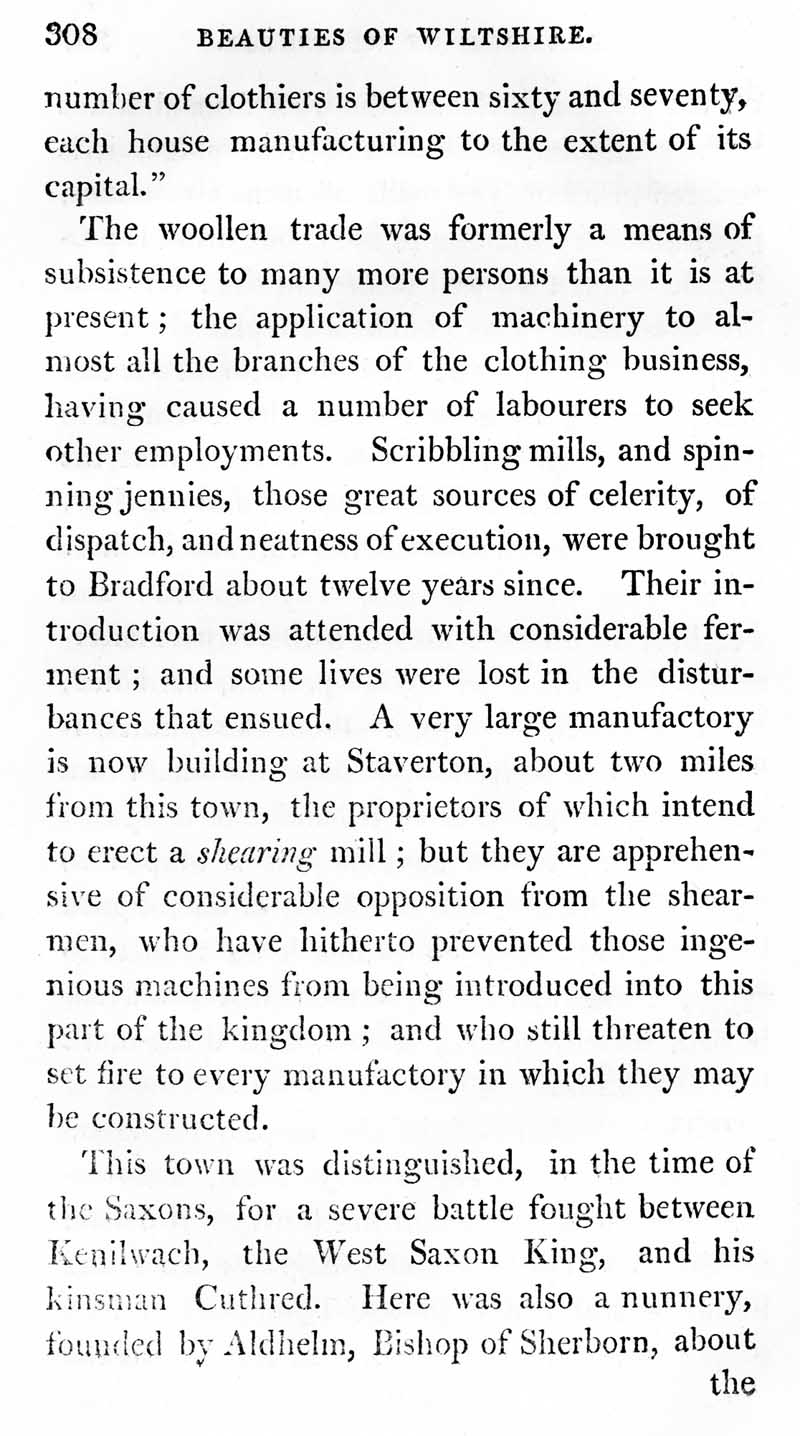 Page 7 Bradford on Avon; cloth industry and wool processing, employment. Mill at <br />Staverton, shearmen's riots.