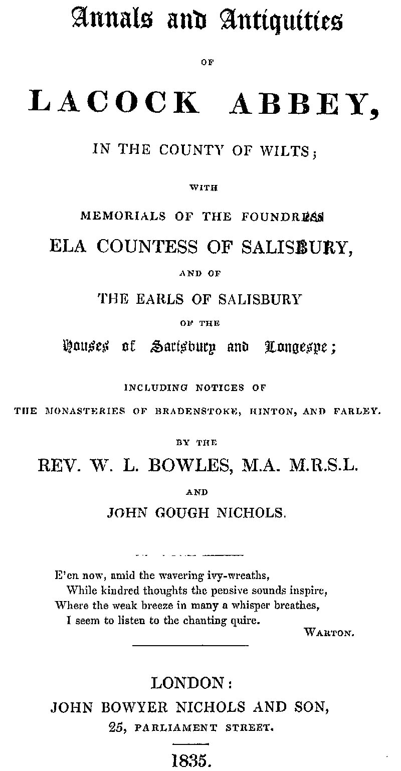 Book 10 Annals and antiquities of Lacock Abbey, by William Lisle Bowles, 1838