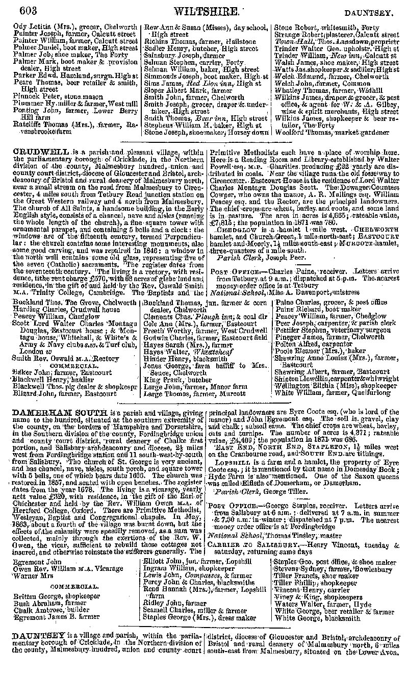 Page 48 Cricklade; businesses from Ody to Woolford. Description and residents of Crudwell, South Damerham and Dauntsey.