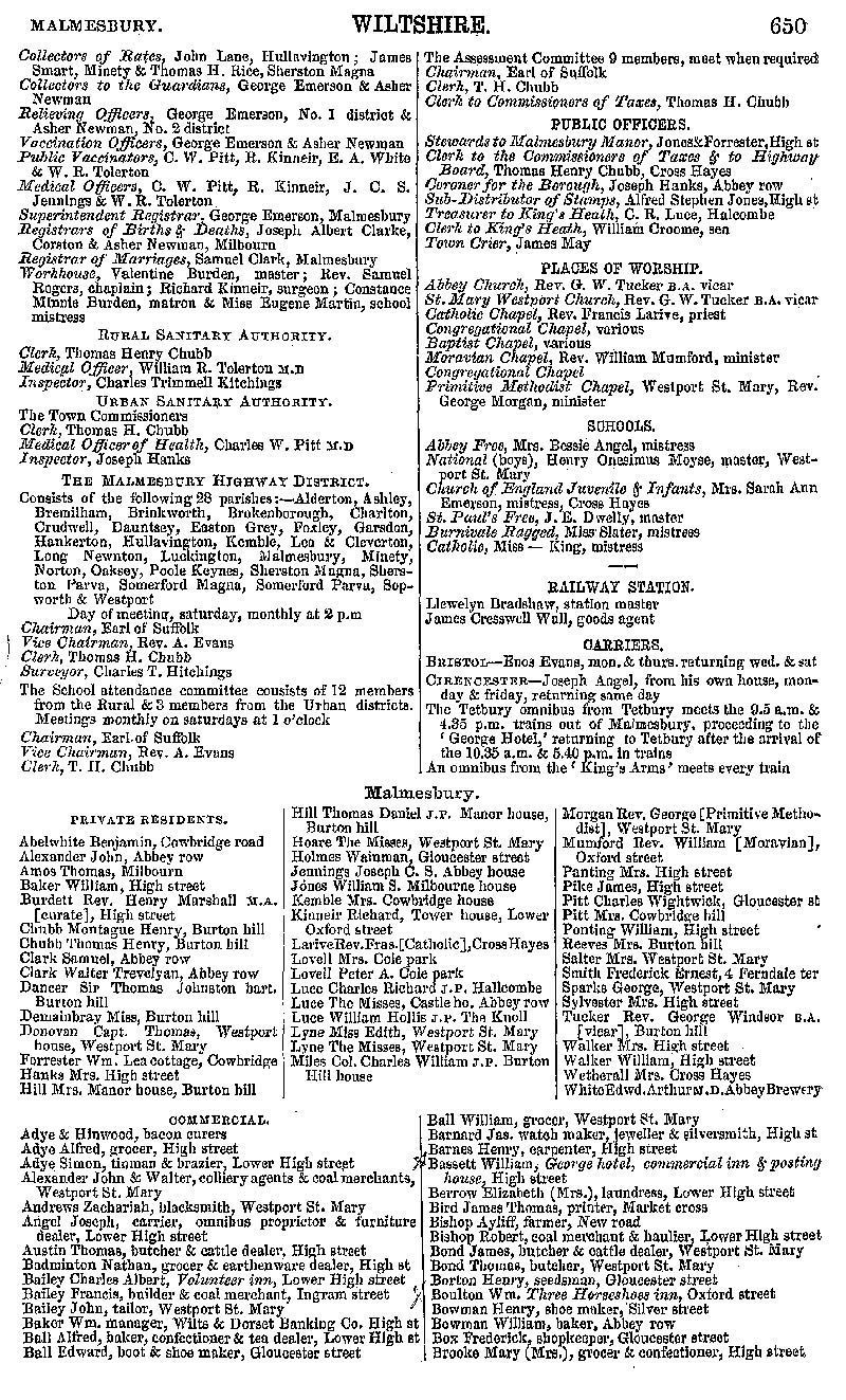 Page 95 Malmesbury: official establishments and local institutions, churches, schools and carriers; private residents, businesses from Adye to Brooke.