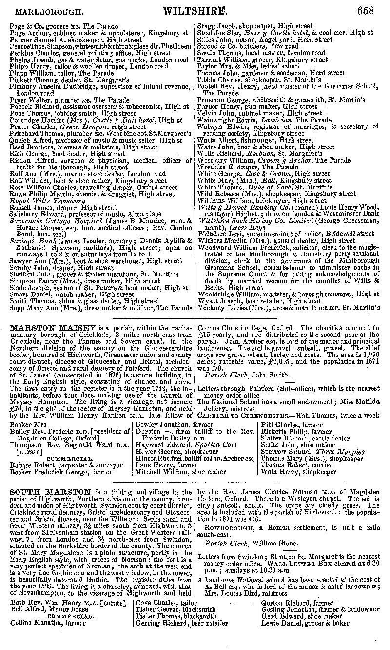 Page 103 Marlborough; businesses from Page to Yockney. Description and residents of Marston Maisey and South Marston.