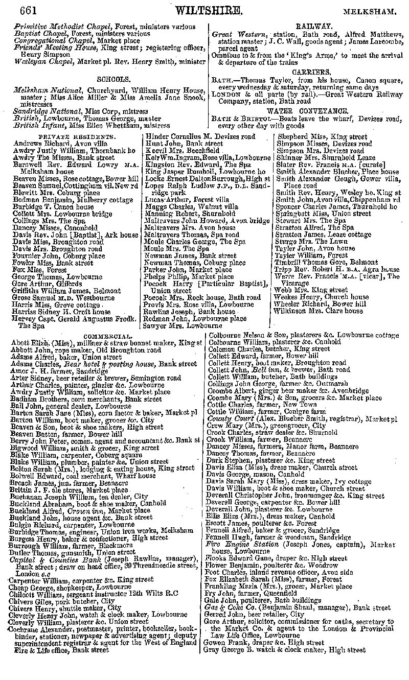 Page 106 Melksham; churches, schools, railway, carriers and boats, private residents, businesses from Abott to Gray.