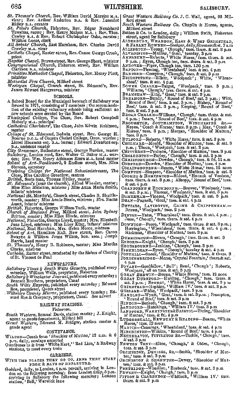 Page 130 Salisbury with Fisherton Anger, East Harnham and Milford; churches, schools, newspapers, railway, coaches, carriers.