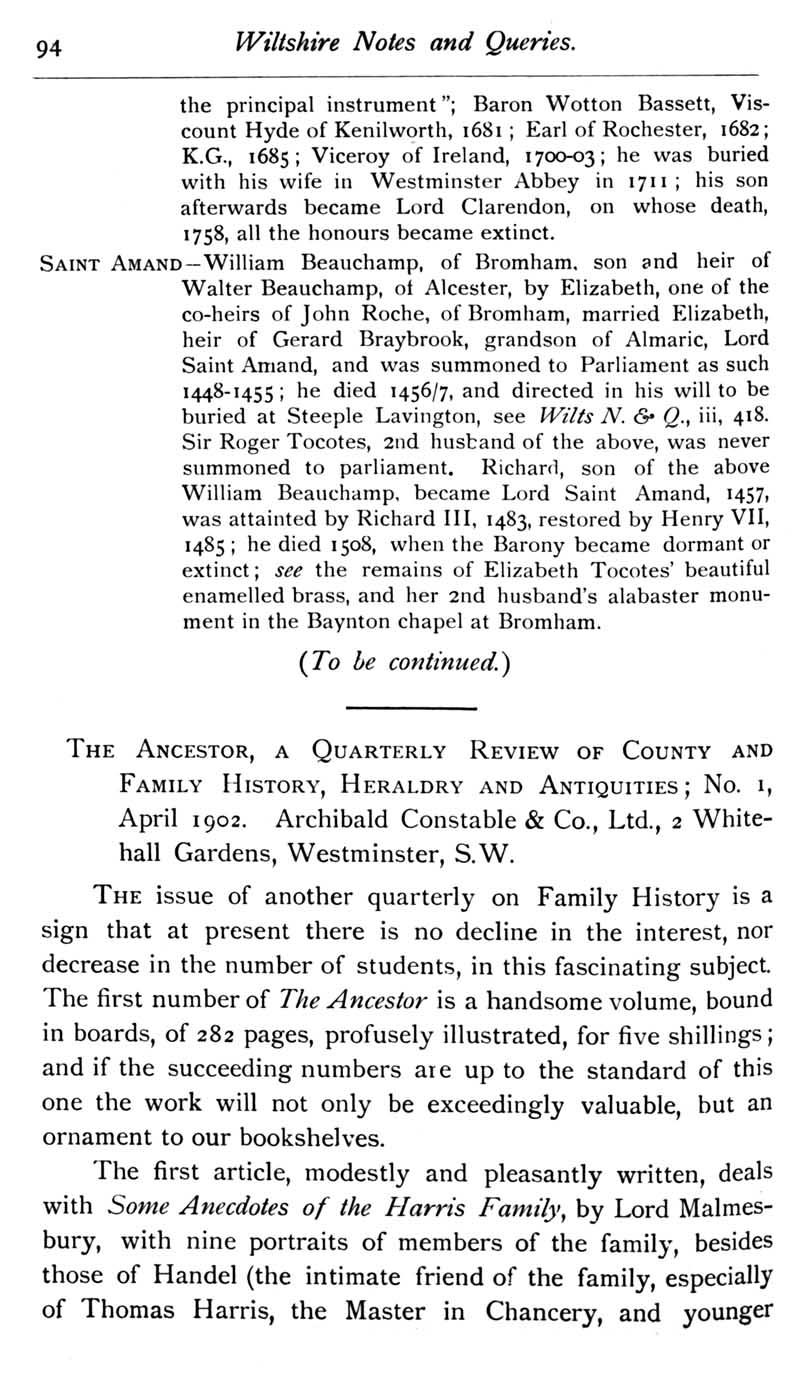 Page 47 Wiltshire Peerage, Family History Quarterly announcement