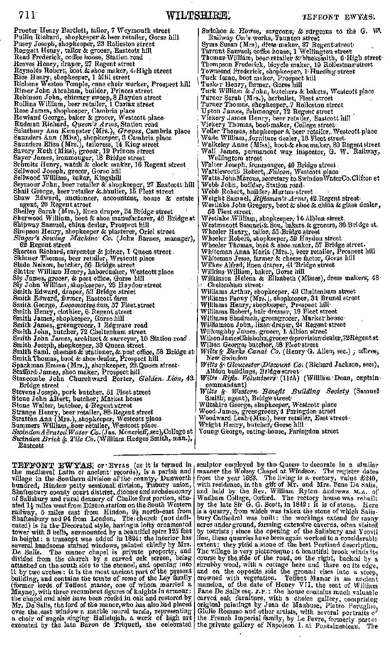 Page 156 Swindon; carriers, businesses in New Swindon from Procter to Young. Description and residents of Teffont Evias.