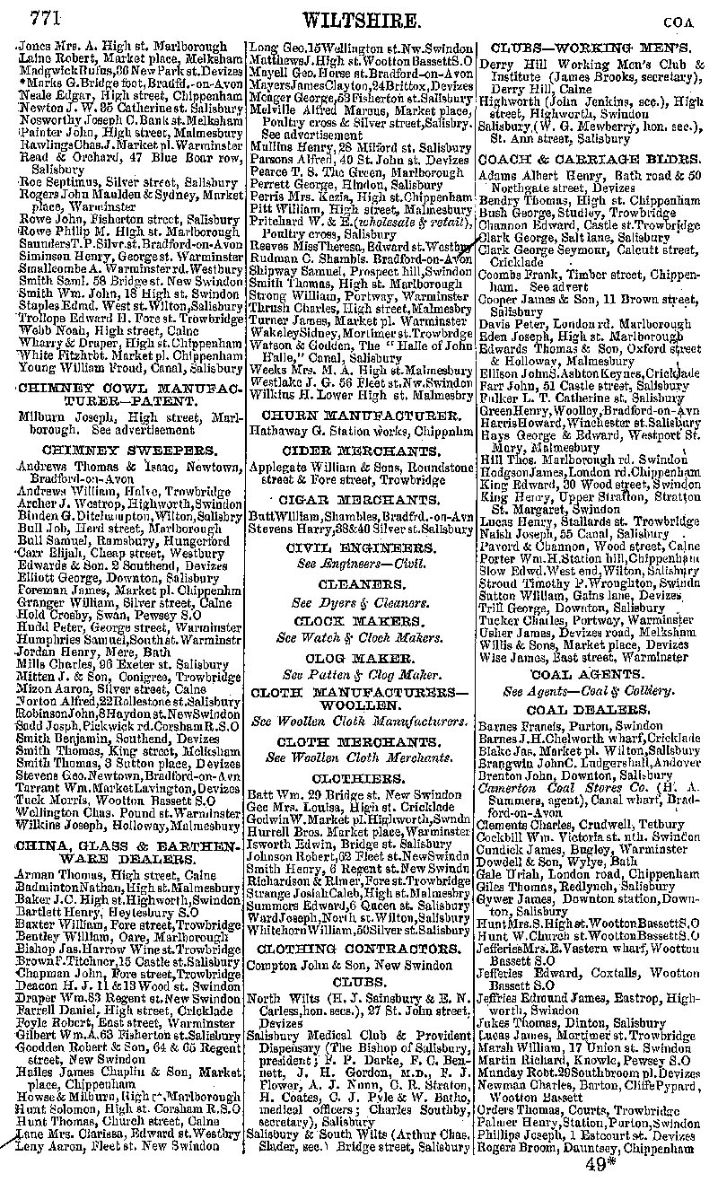 Page 29 Businesses by subject; Chemist and Druggists (from Jones to Young), Chimney Cowl Manufacturer, Cider Merchants, Cigar Merchants, Clothiers, Clothing Contractors, Clubs, Working Men's Clubs, Coach and Carriage Builders, Coal Dealers (from Barnes to Rogers)