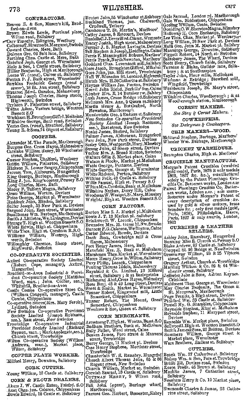 Page 31 Businesses by subject; Contractors, Coopers, Co-operative Societies, Copper Plate Worker, Cork Cutter, Corn and Flour Dealers, Corn Factors, Corn Merchants, Wooden Crib Makers, Cricket Warehouse, Crucible Manufacturers, Curriers and Leather sellers, Cutle