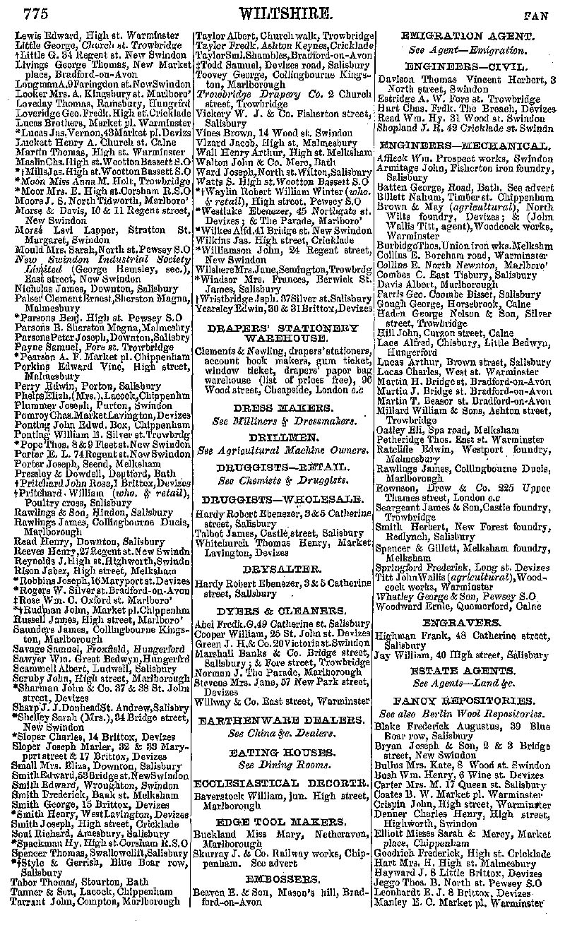 Page 33 Businesses by subject; Drapers (from Lewis to Yearsley), Wholesale Druggists, Drysalter, Dyers and Cleaners, Ecclesiastical Decorator, Edge Tool Makers, Embossers, Civil Engineers, Mechanical Engineers, Engravers, Fancy Repositories (from Blake to Manley)