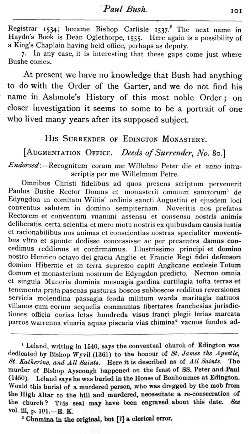 Chapter 4 Paul Bush, Last Rector of Edington ,Records of Wiltshire Parishes,Quakersim in Wiltshire,The Freedom of Sarum,Feet of Fines for Wiltshire,Family Names,Amesbury Monastery,Wiltshire Quakers in America,Queries and Replies
