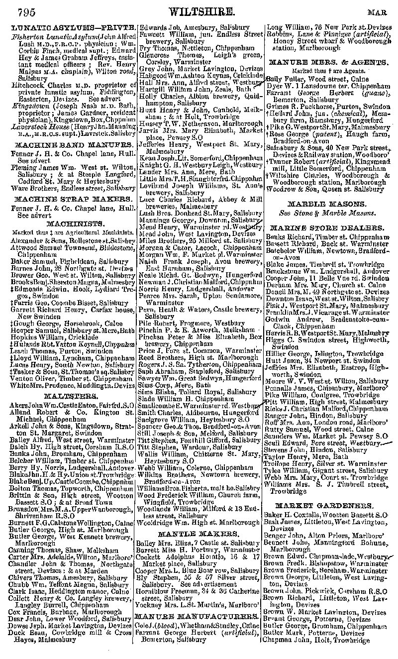 Page 53 Businesses by subject; Private Lunatic Asylums, Machine Band Manufacturers, Machine Strap Makers, Machinists, Maltsters, Mantle Makers, Manure Manufacturers, Manure Merchants and Agents, Marine Store Dealers, Market Gardeners (from Baker to Chapman).
