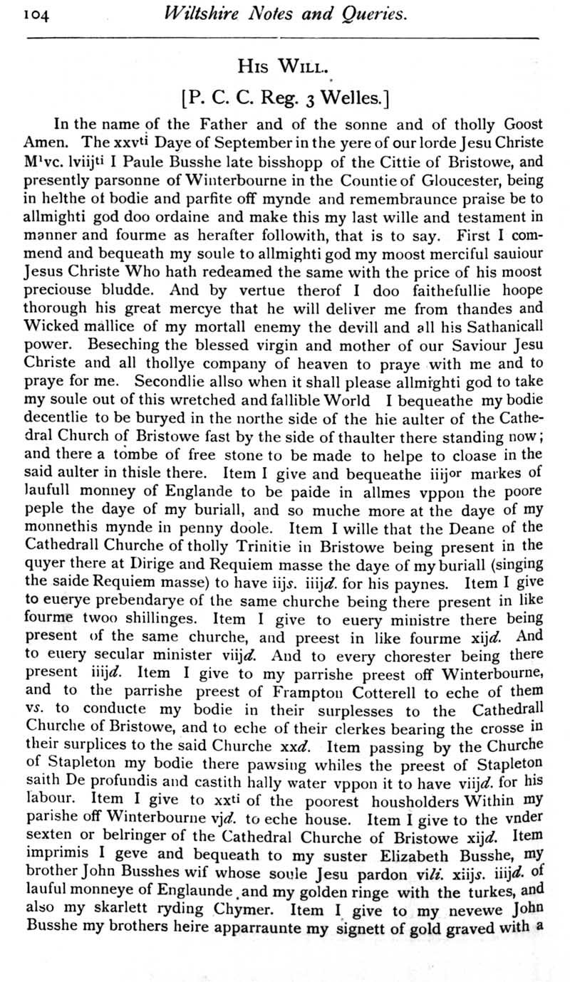 Chapter 4 Paul Bush, Last Rector of Edington ,Records of Wiltshire Parishes,Quakersim in Wiltshire,The Freedom of Sarum,Feet of Fines for Wiltshire,Family Names,Amesbury Monastery,Wiltshire Quakers in America,Queries and Replies