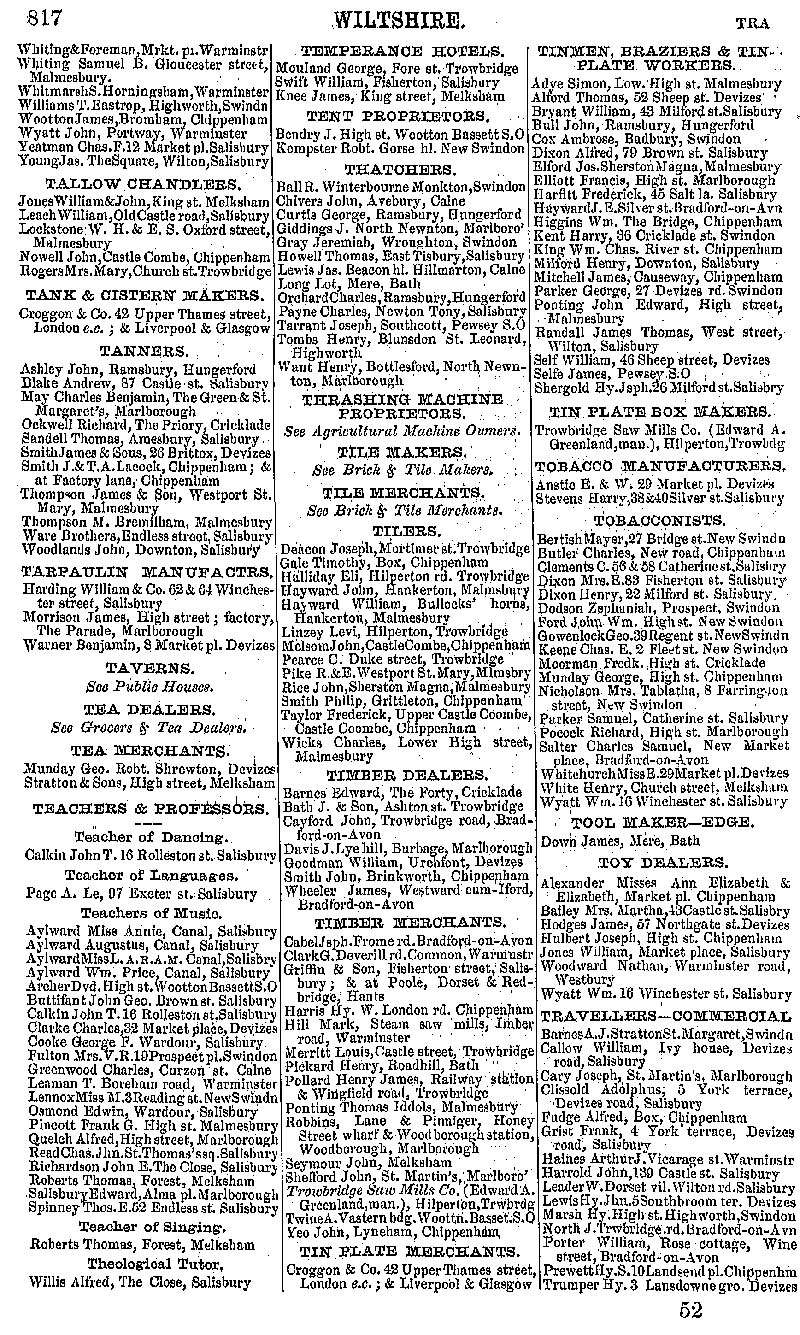 Page 75 Businesses by subject; Tailors (from Whiting to Young), Tallow Chandlers, Tanners, Tarpaulin Manufacturers, Tea Merchants, Teachers and Professors, Temperance Hotels, Tent Proprietors, Thatchers, Tilers, Timber Dealers, Timber Merchants, Tinmen, Braziers,