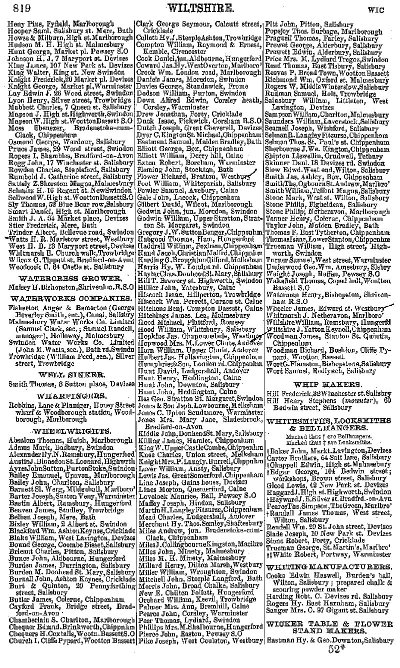Page 77 Businesses by subject; Watch and Clock Makers (from Heny to Woodcock), Watercress Grower, Waterworks Companies, Well Sinker, Wharfingers, Wheelwrights, Whip Makers, Whitesmiths, Locksmiths and Bellhangers, Whiting Manufacturers, Wicker Table and Flower St
