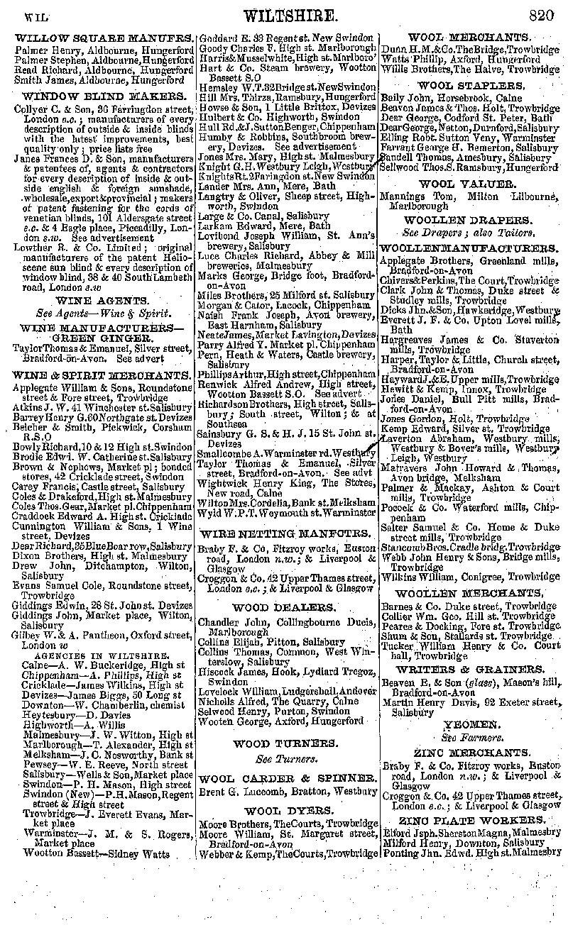 Page 78 Businesses by subject; Willow Square Manufacturers, Green Ginger Wine Manufacturers, Wine and Spirit Merchants, Wood Dealers, Wool Carder and Spinner, Wool Dyers, Wool Merchants, Wool Staplers, Wool Valuer, Woollen Manufacturers, Woollen Merchants, Writer