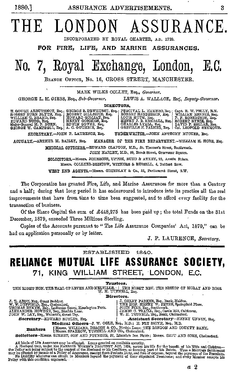 Page 3 Advertisements for the London Assurance, and the Reliance Mutual Life Assurance Society.