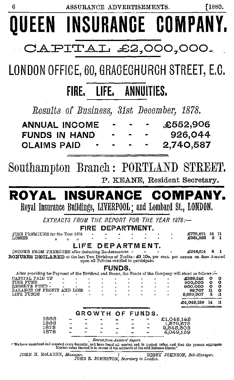 Page 6 Advertisements for the Queen Insurance Company, and the Royal Insurance Company.