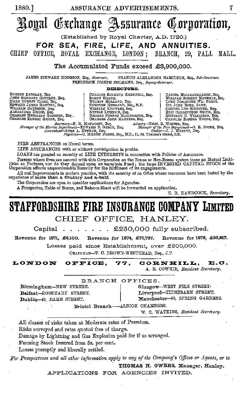 Page 7 Advertisements for the Royal Exchange Assurance Corporation, and the Staffordshire Fire Insurance Company Limited.