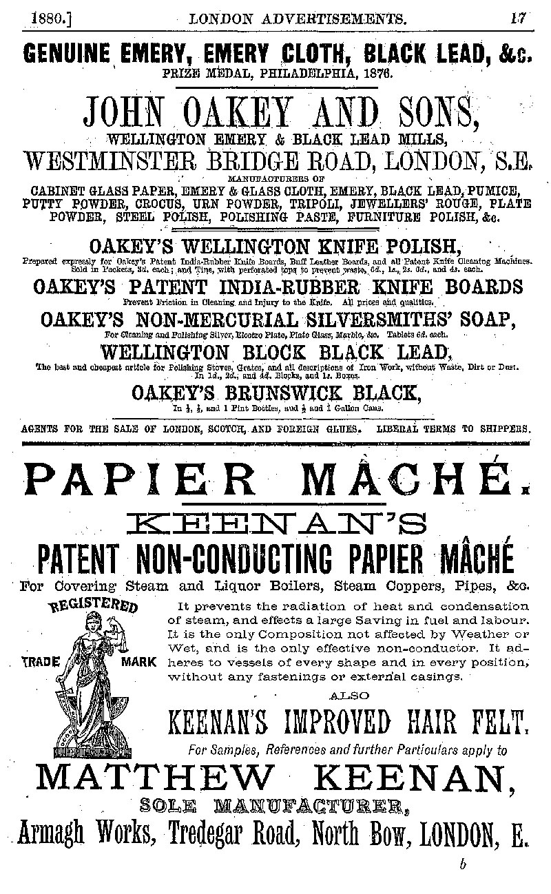 Page 17 Advertisements for John Oakey and Sons (emery and black lead mills), and Matthew Keenan (non-conducting papier mache).